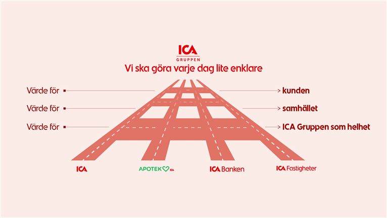 Samtidigt tar vi tillvara kraften i vårt gemensamma ekosystem genom koncerngemensamma initiativ inom prioriterade områden. Genom ökad samverkan och ett samlat erbjudande skapar vi större värde för våra kunder, för samhället och för ICA som helhet.
